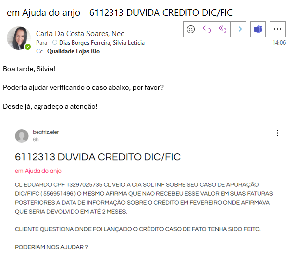 CL EDUARDO CPF 13297025735 CL VEIO A CIA SOL INF SOBRE SEU CASO DE APURAÇÃO DIC/FIFC ( 556951496 ) O MESMO AFIRMA QUE NAO RECEBEU ESSE VALOR EM SUAS FATURAS POSTERIORES A DATA DE INFORMAÇÃO SOBRE O CRÉDITO EM FEVEREIRO ONDE AFIRMAVA QUE SERIA DEVOLVIDO EM ATÉ 2 MESES.