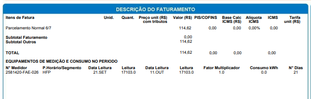 Sim. Na fatura referente a outubro não foi cobrado consumo, apenas o parcelamento.