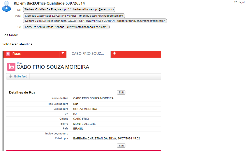 Prezados, bom dia! Poderiam criar endereço para conclusão de ligação nova? Endereço: RUA SOUZA MOREIRA - MONTE ALEGRE - CABO FRIO/RJ